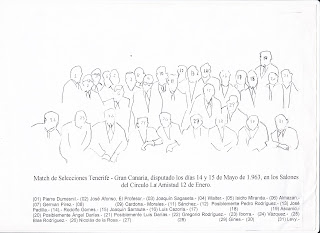 Aquí dejamos una foto tomada en el Círculo de la Amistad de Tenerife en mayo de 1963, en uno de esos encuentros. Se acompaña del texto de identificación de la mayor parte de los jugadores. Ambos documentos han sido facilitados por Pierre Dumesnil con dedicación a todo el ajedrez canario.